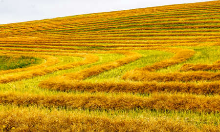 Spring yellow rapeseed field with stripes and wavy landscape pattern