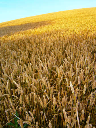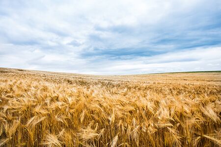 Ripe golden wheat field against the blue sky background. Landscape photography