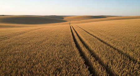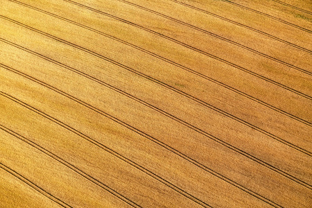Aerial drone shot of tractor tire tracks on wheat field at sunset. Top down agriculture background
