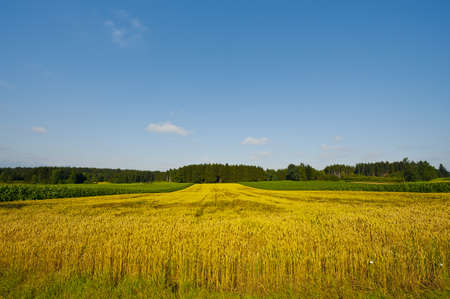 harvested and unharvested field with straw lines, summer agriculture concept, czech republic. In front ripe wheat