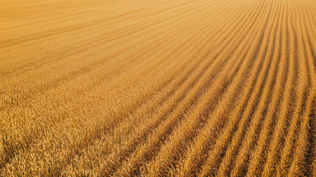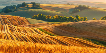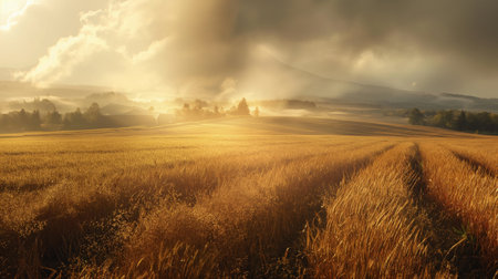 Dark atmospheric landscape of a golden agricultural field at sunset. Soft sunlight. Idyllic summer rural scene. Textures. Nature, environnement, farm, countryside living, ecotourism