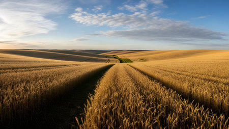 Panoramic sunset and clouds over a wheat field with a path to the horizon panorama web banner header