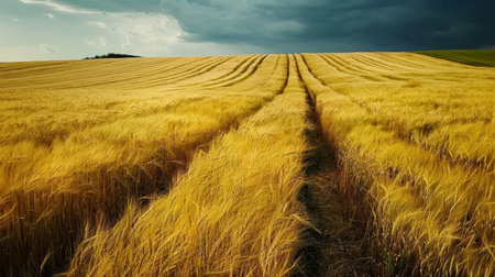 Beautiful magical landscape with stripes in the field of wheat against the background of cloudy sky (abundance, riches, farming, harvest - concept)
