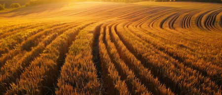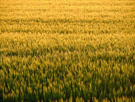 Top view of a sunset or sunrise in an agricultural field with ears of young golden rye on a sunny day. Rural landscape.