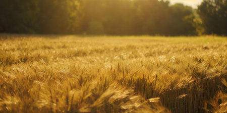 Close-up wheat field with ripening ears on the sunset, idea of a rich harvest