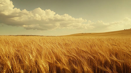 Golden grass sways gently in a vast field beneath a clear blue sky filled with fluffy clouds.