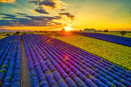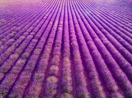 Lavender field at sunset. Rows of blooming lavende to the horizon. Provence region of France.