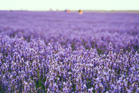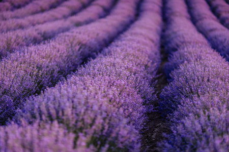 Close up Lavender flower blooming scented fields in endless rows on sunset. Selective focus on Bushes of lavender purple aromatic flowers at lavender fields Abstract blur for background.