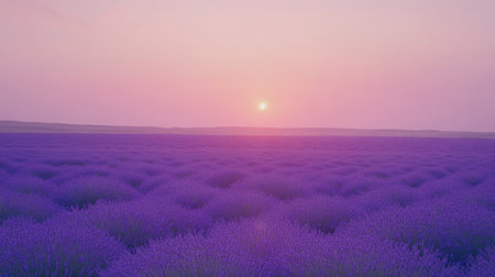 This digital artwork captures a serene lavender field bathed in the soft glow of sunset. The image showcases a gradient of calming purple tones with accents of golden yellow light, creating a tranquil atmosphere. Ideal for use in wellness and relaxation themed projects or as a soothing backdrop for digital designs. AI-generated illustration.
