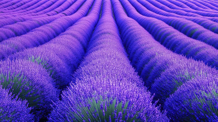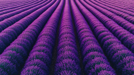 Vibrant lavender field in full bloom captivating rows of purple flowers from a top down view