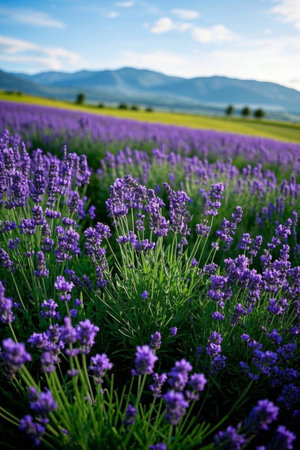 Lavender flowers sway gently in the warm summer breeze, creating a vibrant purple tapestry that perfumes the countryside with a soothing scent.