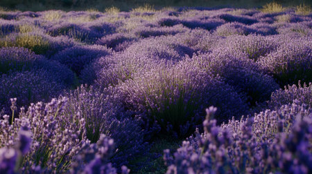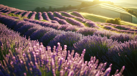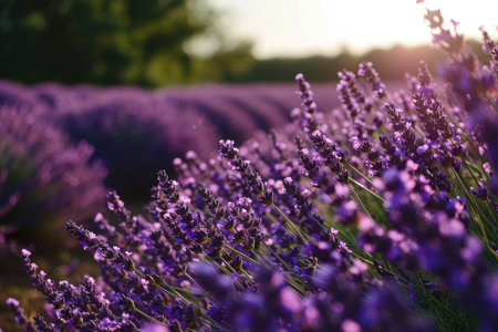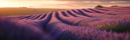 Beautiful violet lavender flowers swaying in the wind during sunset over a lavender field. This image captures the essence of lavender harvest, perfume making and aromatherapy with its delicate blooms and sweet fragrance.