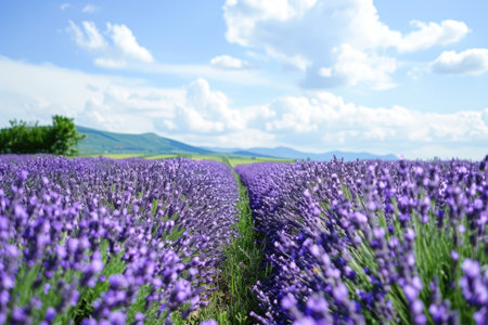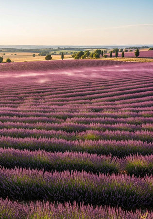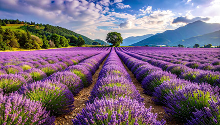 Vast lavender fields stretch endlessly, creating a mesmerizing sea of purple hues. The neatly arranged rows of blooming flowers evoke a sense of tranquility and natural beauty