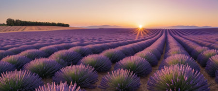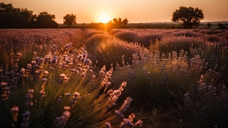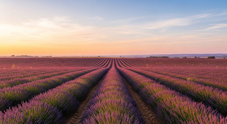 Stunning landscape of a tranquil lavender field bathed in the warm vibrant hues of a captivating sunset or sunrise The rows of blooming purple flowers stretch out into the horizon