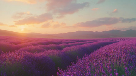 A breathtaking sunset casts a warm glow over a vast lavender field, showcasing an array of purple hues. The tranquil atmosphere invites reflection and peace.