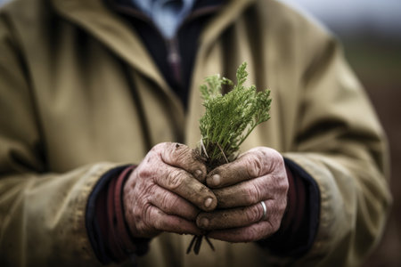 closeup of an unrecognizable farmer holding a seedling, created with generative ai