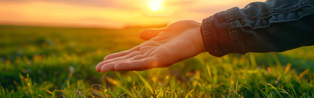 Capturing the Stunning Beauty of Nature Hands Gently Touching the Sunlit Field Around Us