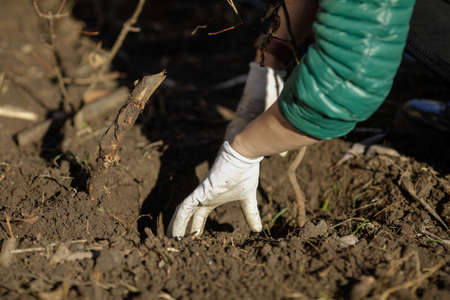 Planting a sprouted seed in the ground, theme garden and vegetable garden.