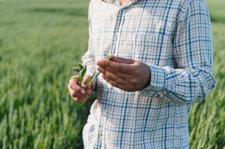 Agronomist examining wheat ears in a cultivated field, assessing the health and growth of the young crop
