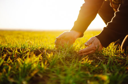 Farmer examining wheat plants in wheatgrass field, close up of hand touching green cereal crop sprouts, selective focus