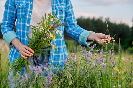 Woman with bouquet of field herbs and flowers touching blooming plants in summer field