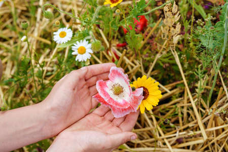 Closeup of child hand with different summer flowers. Beautiful blooming field flowers. Children and environment, ecology concept.