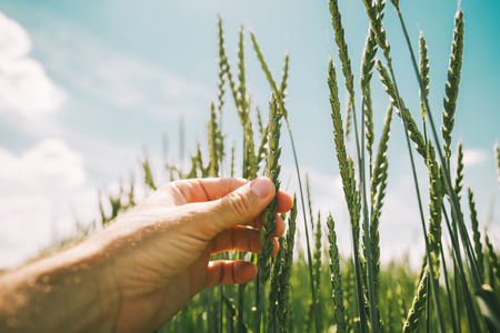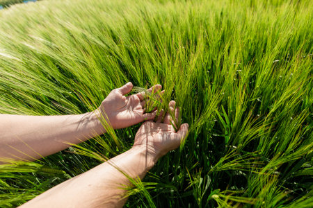 Farmer examining spelt wheat crop development in cultivated field, close up of hand touching plant ears