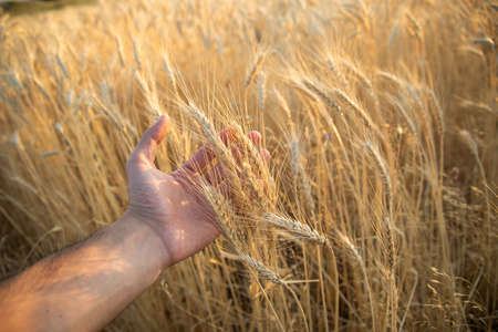 The hand touches the ears of wheat. Farmer in a wheat field. Rich harvest concept