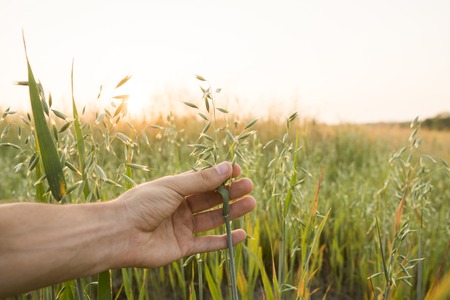 Close-up of man hand touching holding crops, young green oat ears on a field in sunset. Close up on a beautiful field. Ripening ears of oats. Agriculture. Natural product.