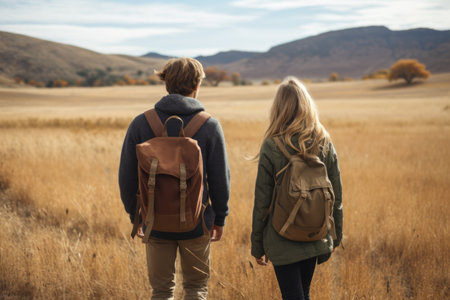 Exploring Together: Adventurous Duo Standing on Lush Brown Grass Field with Backpacks