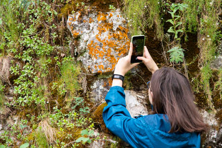 View of a girl photographing moss with a phone, flowers for her blog. Travel, travel photos, blog, vlog.