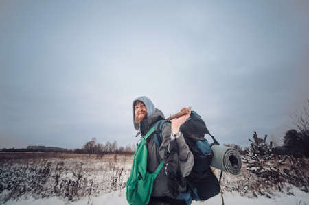 Portrait of smiling bearded man hiker, who relaxing in the winter forest. Toned image. Man with a beard tourist in a winter forest. in field