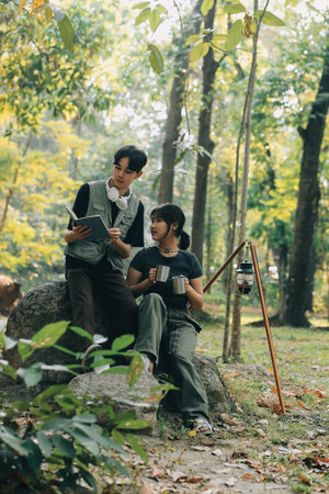 Two Young Traveler with backpack, are holding map relaxing and taking photo in greens jungle and enjoying with outdoor forest on background Summer vacations and Lifestyle hiking concept.