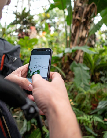 A traveler uses a mobile application on their smartphone to identify a tropical plant while exploring a dense, verdant jungle.