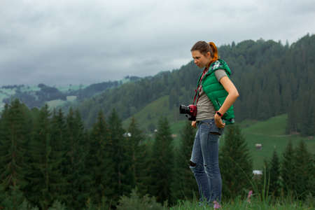 girl photographer in the mountains shoots the landscape on the background of a cloudy day