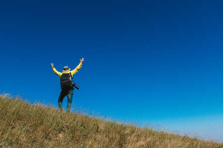 Backpacker man walking in the countryside, adventurous man descending from a hill, man with backpack going down a hill