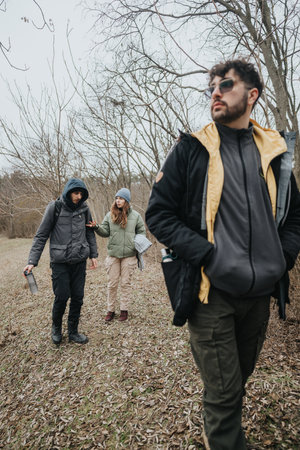 Group of friends hiking in a forest during wintertime outdoors adventure
