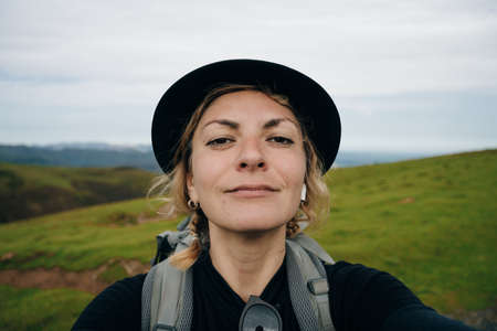 girl traveler pilgrim selfie on Camino de Santiago, to Compostela on the Pyrenees, Navarra, Spain. High quality photo