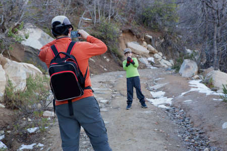 Man photographing son holding snowball in Andes, Valparaiso, Chile