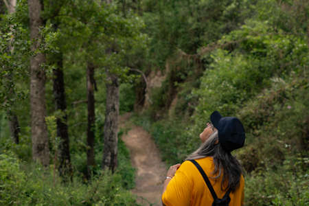 white-haired woman in the forest with cap, backpack and hiking stick admiring the scenery
