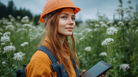 A woman wearing a hard hat, holding a tablet in a flower field, representing modern farming technology and environmental management.