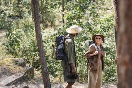 Interracial tourists with backpacks and binoculars in forest