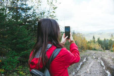 Back view of a tourist-girl in a red raincoat with backpack, taking pictures of the mountains on the phone.