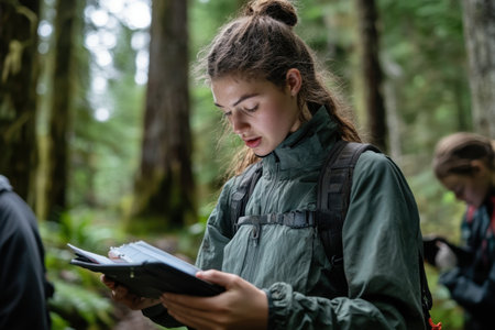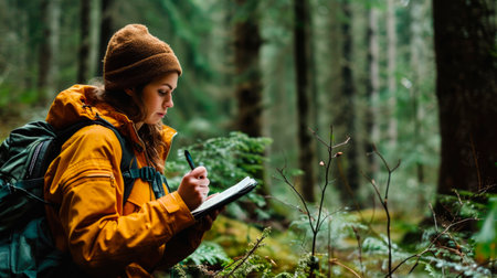 A young researcher is focused on her notes as she stands in a lush, green forest. Fellow participants are visible, engaged in their own observations amidst the trees.