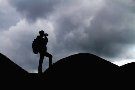 Silhouette of a man with backpack in the mountains is taking pictures of the landscape
