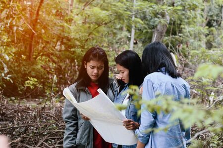 Group of Young Asian women looking map travel trekking to destination in vacation time for go to camping.