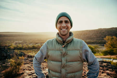 Caucasian male free spirit smiling while enjoying sunset walking in wilderness