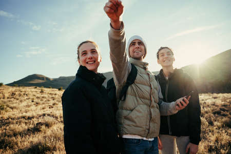 Group of hikers walking through mountain pointing in direction locating destination