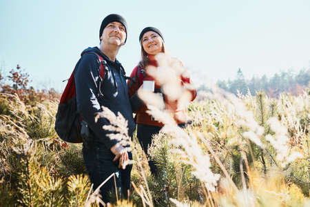 Couple enjoying nature while vacation trip. Hikers with backpacks looking at mountains view. People standing in tall grass on path to mountains on sunny day. Active leisure time close to nature