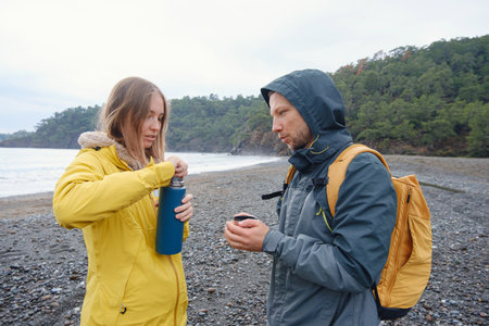 Couple enjoys the coastline. Sitting on stones, watching sea waves, relaxing together, slow romantic moment near calm blue water under soft winter light.